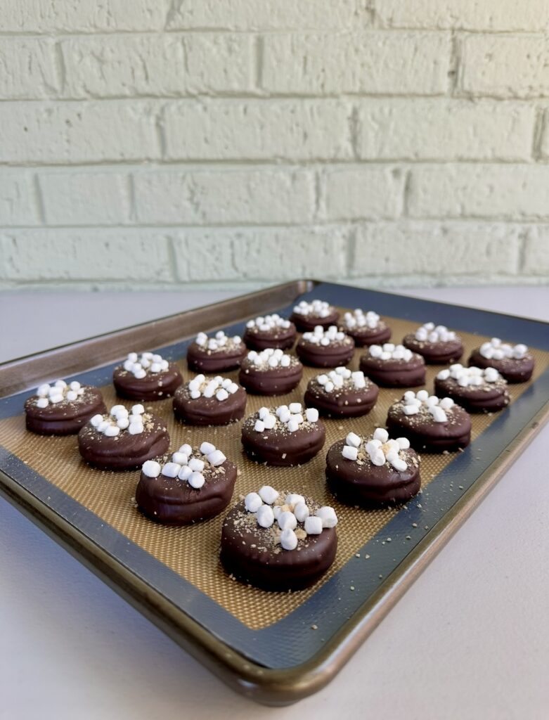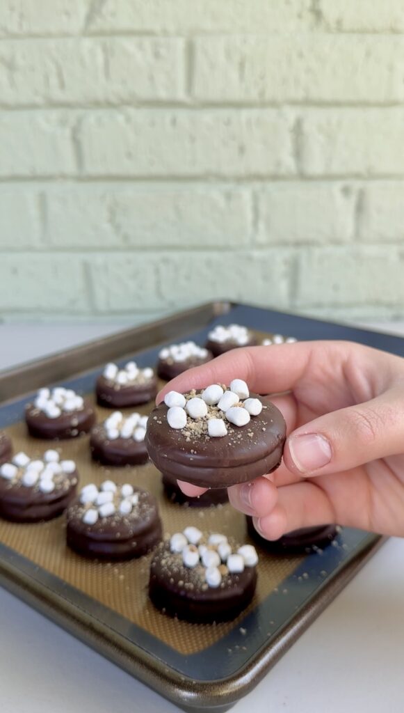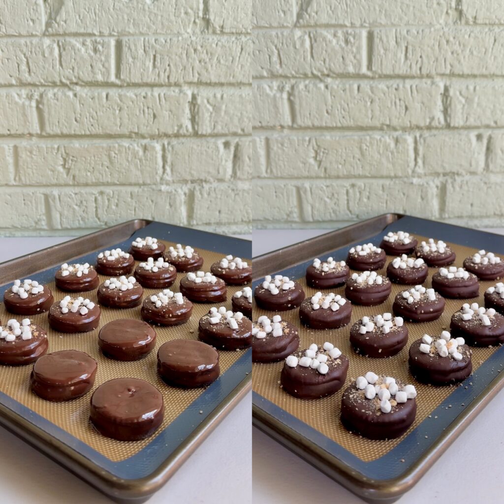 - While the chocolate is still wet, sprinkle each cookie with marshmallow bits and graham cracker crumbs.