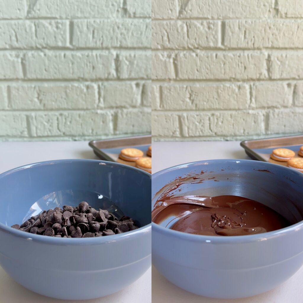 - COATING: Adding vegetable oil to the chocolate chips helps the chocolate become super smooth and the perfect consistency for dipping. It also helps the excess chocolate drip off after coating the cookies because it’s a thinner consistency.