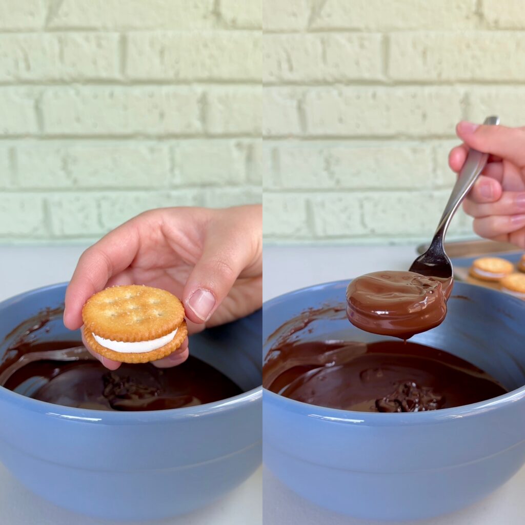 - Working one by one, use a fork to coat the Ritz cookies into the melted chocolate. Let the excess chocolate drip off, then return to the lined baking sheet.