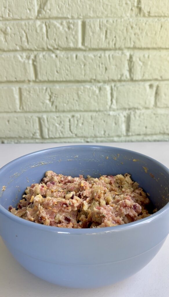• Combine the uncooked sausage, prepared stuffing mix, shredded cheddar cheese, dried cranberries, eggs, chicken broth, and salt and pepper. Mix by hand or with an electric mixer until well-combined.