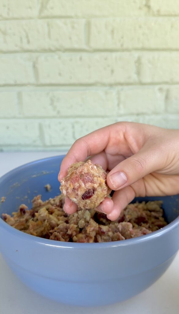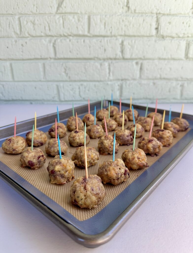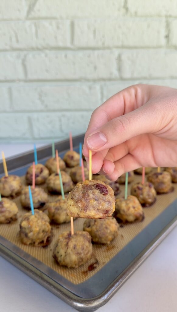 • Once the sausage stuffing balls are done, remove them from the oven and cool slightly. Serve by themselves or with a cranberry sauce and/or gravy on the side for dipping!