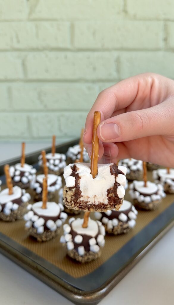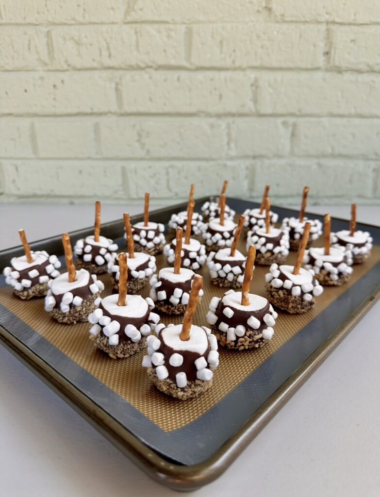 Instead of sandwiching everything between graham crackers, you slide a pretzel stick into a marshmallow to create the “handle.” Then you dip it into smooth melted milk chocolate and roll it in crushed graham cracker crumbs. A light sprinkle of marshmallow bits on top makes them look bakery-worthy!