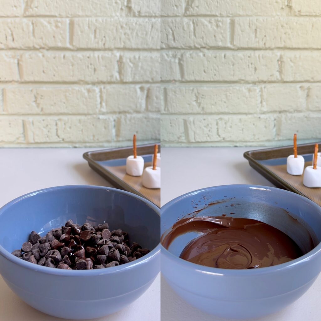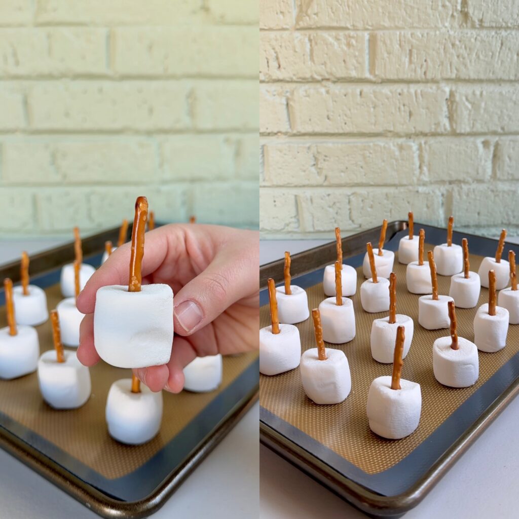 - Insert a pretzel stick into the top of each marshmallow, then place them on a baking sheet with parchment paper or a silicone baking mat.