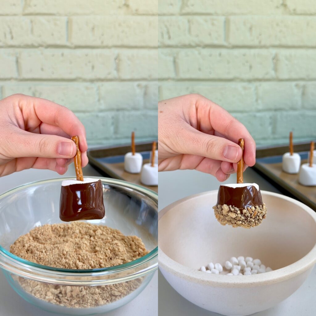 - Dip each marshmallow into the melted chocolate, then dip the bottom half into the bowl of graham cracker crumbs, and sprinkle the top half with marshmallow bits.
