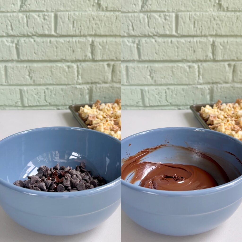 - Transfer the melted chocolate into a ziploc bag, cut off one end, and drizzle the chocolate over the popcorn.