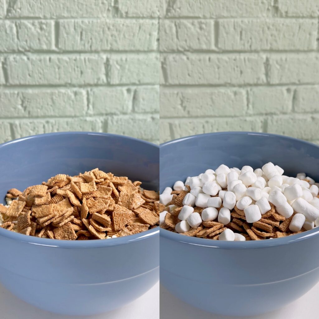 - Pour the popcorn into a large bowl, remove any unpopped kernels, then add in the Golden Grahams and 2 cups of mini marshmallows. Mix to combine, then set it aside.