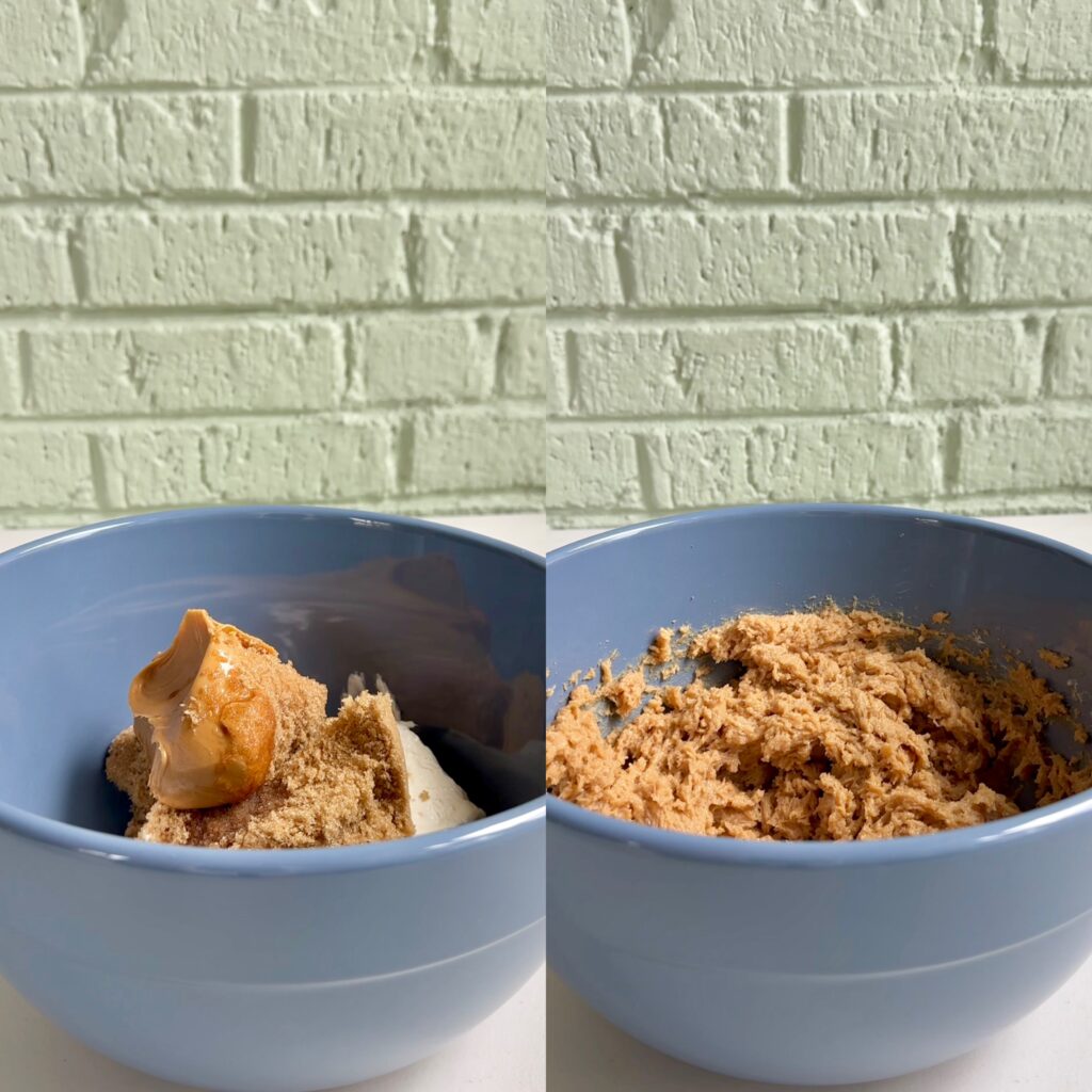 • In a medium mixing bowl, combine softened cream cheese, brown sugar, peanut butter, and vanilla extract,, then mix until smooth.