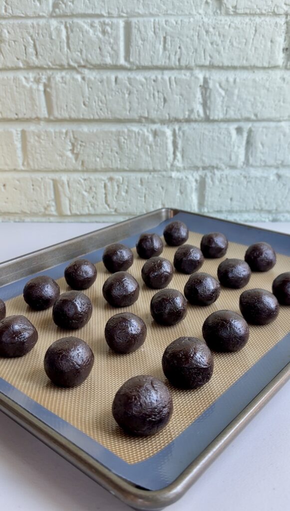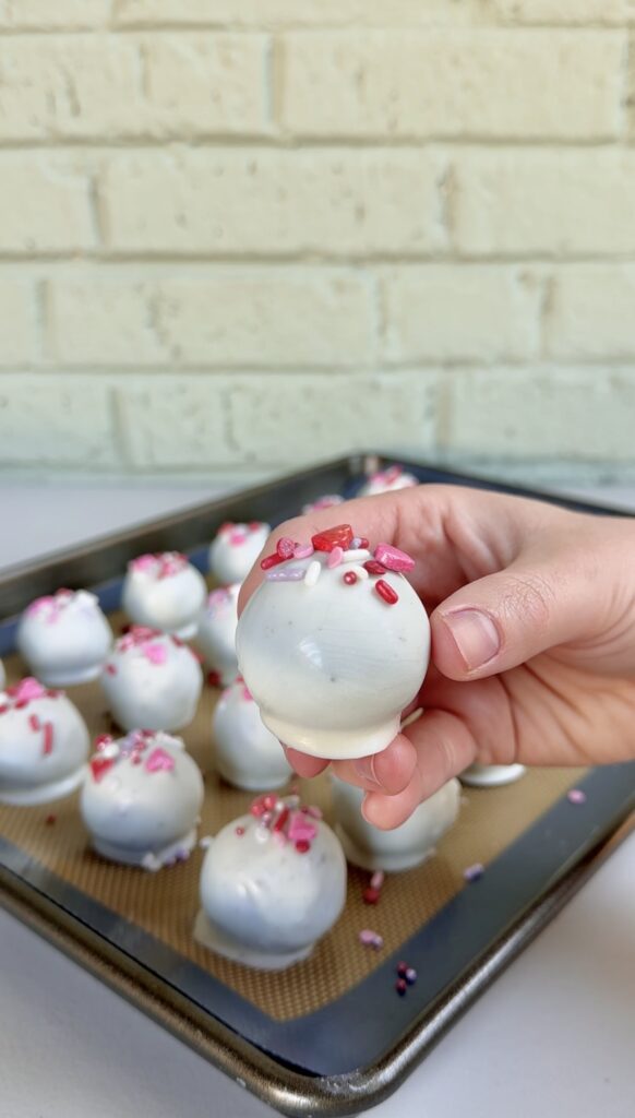 - FREEZING: Don’t skip this step! Placing the stuffed Oreo balls into the freezer for a few minutes helps them firm up and ensures they will hold their shape while being coated in chocolate. If they aren’t chilled, you will end up with a lot of crumbs in your candy coating and they won’t look quite as pretty.