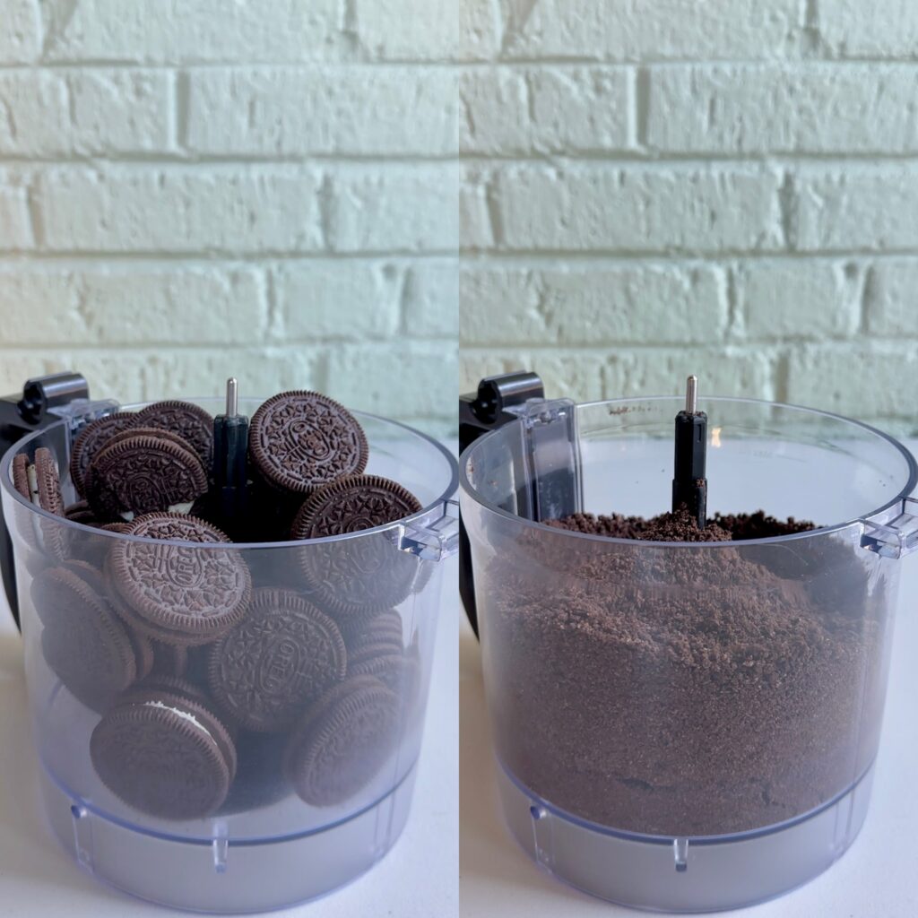 - FOOD PROCESSOR: No food processor? No problem! Using a food processor ensures even, fine crumbs, but if you don’t have one, you can put the Oreos in a large resealable bag and crush with a rolling pin, mallet, or something similar. Just be sure that there aren’t any large chunks of cookies left when you’re done.