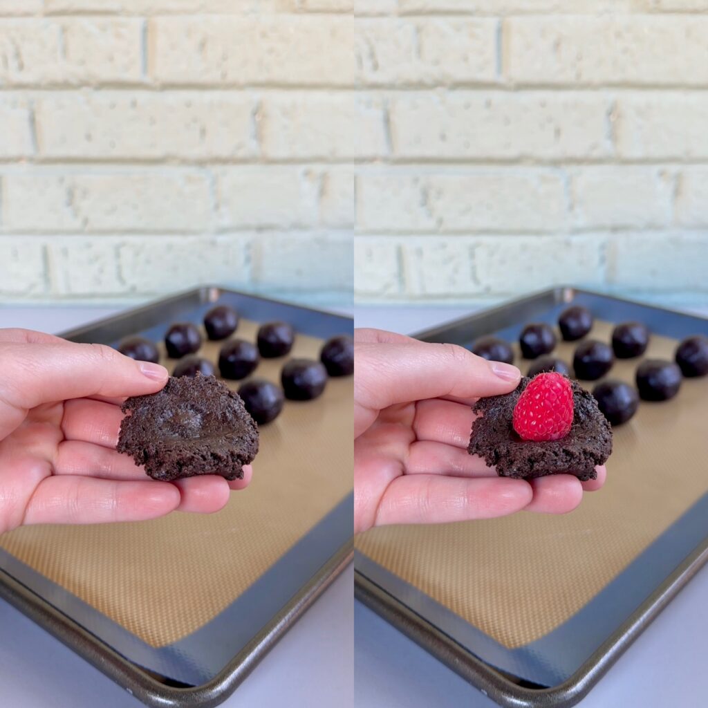- Working one by one, scoop the mixture out about 1 Tbsp at a time. Flatten out the ball and place one raspberry in the center. Wrap the Oreo mixture around it to seal, then place on the lined baking sheet.