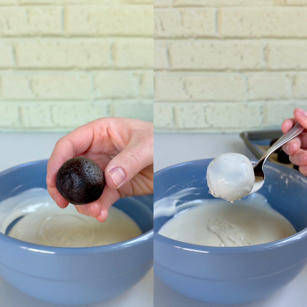 - COATING: I find a fork is a great tool to use to coat the Oreo balls in the melted chocolate, as the chocolate can drip off through the prongs of a fork. After you coat each Oreo ball, tap the fork against the bowl so the excess chocolate drips off. You’ll also want to scrape all the excess chocolate off the bottom of your Oreo balls so that it won’t create a pool or “foot” at the bottom.